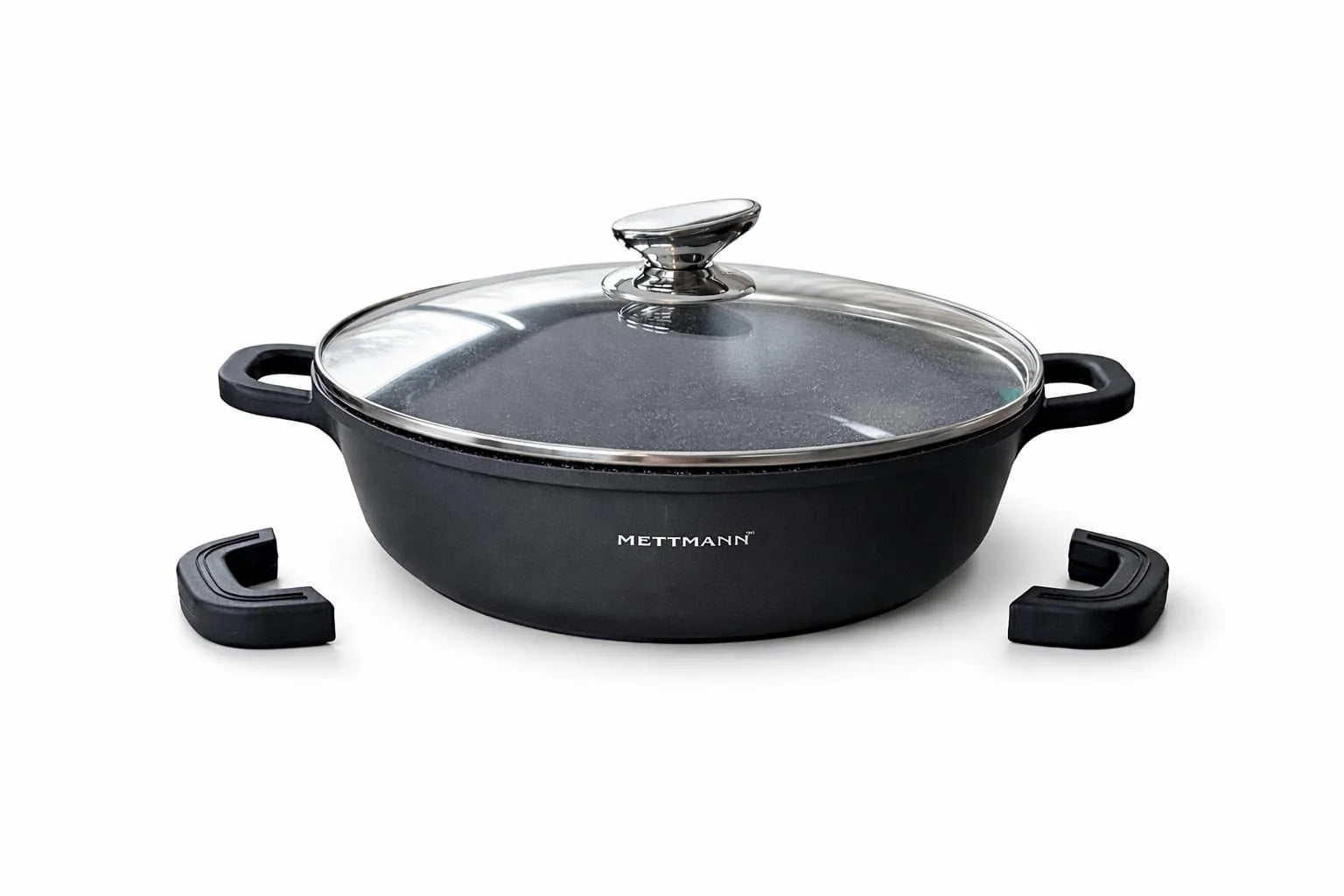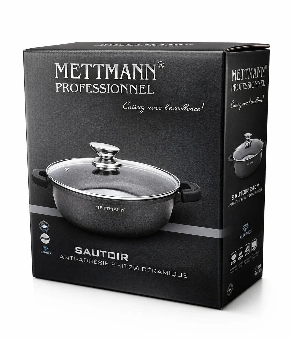 Sautoir 24 cm METTMANN PROFESSIONNEL – Fonte d’aluminium haute qualité, revêtement effet pierre, compatible tous feux dont induction. Découvrez le sautoir conçu en fonte d’aluminium ultra résistante pour une durabilité exceptionnelle et une cuisson homogène. Son revêtement céramique antiadhésif haute performance effet pierre, garanti sans PFOA, vous permet de cuisiner sainement, sans ajout de matière grasse, tout en préservant la saveur authentique de vos aliments. Compatible tous feux, y compris induction, gaz, vitrocéramique et plaques électriques, ce sautoir s’adapte à toutes les cuisines. Ses poignées en silicone ergonomiques assurent une prise en main sûre et confortable, tout en facilitant le nettoyage. Pratique et robuste, le sautoir METTMANN PROFESSIONNEL passe au lave-vaisselle pour un entretien sans effort. Idéal pour mijoter, rôtir ou cuire à feu doux, il deviendra vite un indispensable de votre quotidien culinaire.